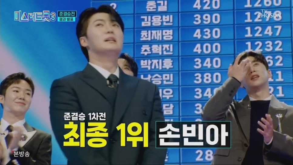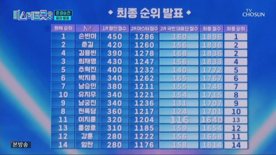 준결승 1차전에서는 1라운드 점수(마스터 + 온라인 투표)와 2라운드 점수(마스터 1300점 + 국민 대표단 200점)가 합산되어 순위가 결정됩니다. 트로트맨 14명 중 최종 순위 TOP10에 들지 못하면 탈락이라는 엄격한 기준이 기다리고 있었습니다. 따라서, 모든 참가자들이 이번 개인전에 사활을 걸고 임했으며, 결과적으로 1위와 10위까지의 순위가 발표되었습니다.