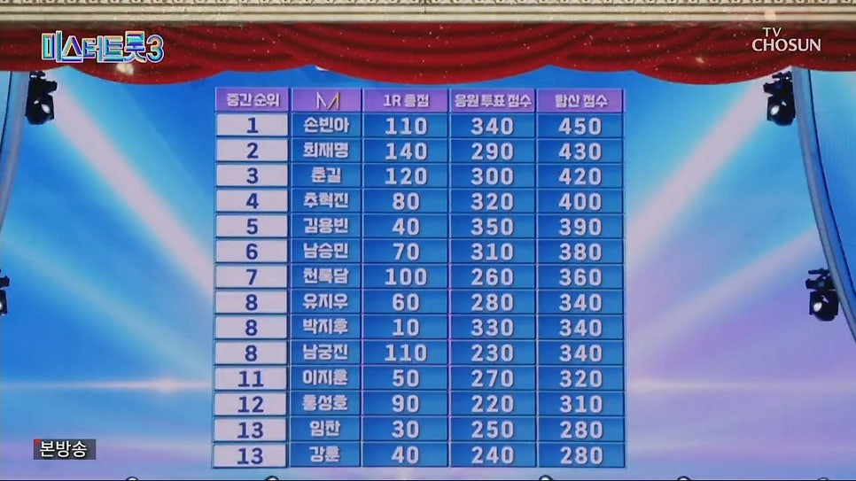 미스터트롯3 10회 준결승 2라운드 개인전 손빈아 1위, 천록담 이정 TOP10 순위
