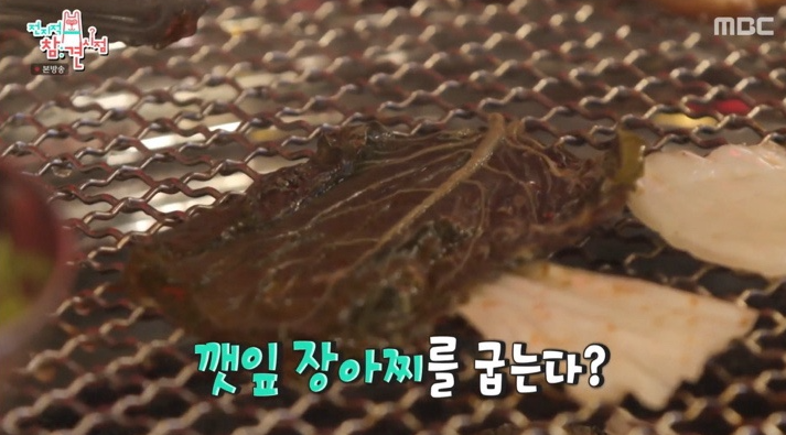 깻잎무침도 석쇠 위에 살짝 구워서 바삭하게 만든 다음,